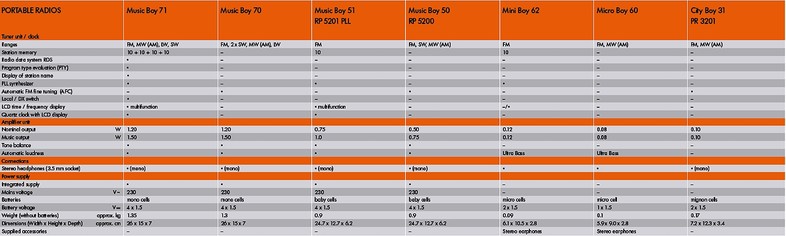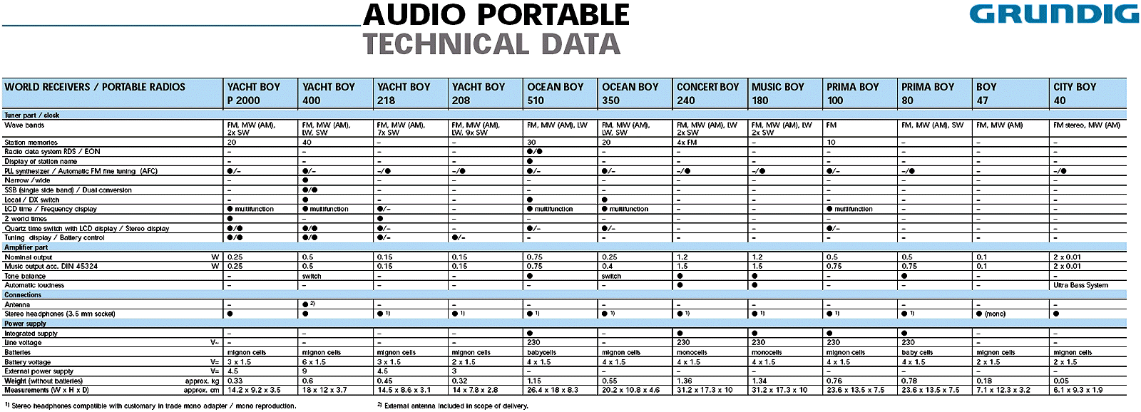 Specifications for Grundig portable radios: