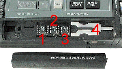 The extra MEMO FILES (1-3) (picture below) can be added (one at a time, if wanted) , by inserting them into a compartment directly below the Grundig Satellit 700 keyboard. Observe the handy Tool (4) for inserting or removing memory modules :